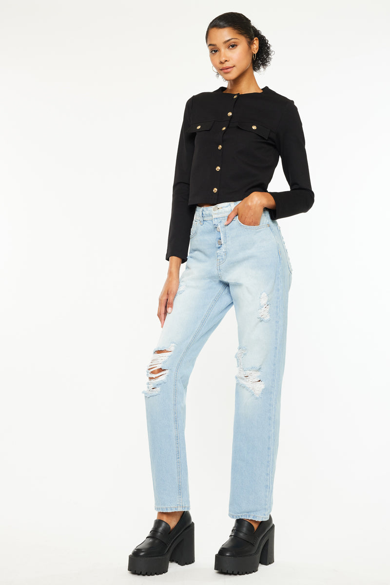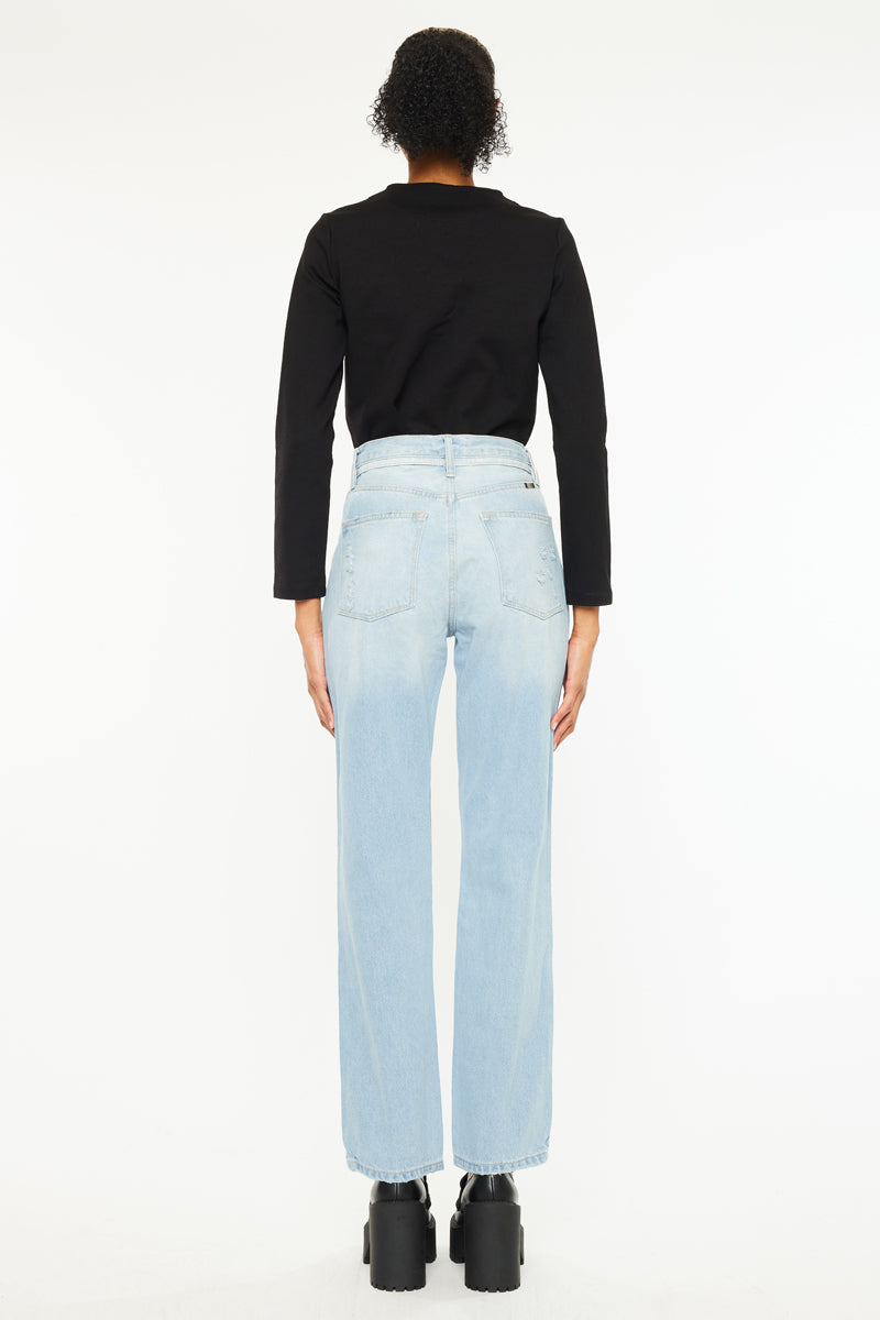 Our light-washed Paula Jeans come in our classic 90's Straight Leg fit with a tattered knee destruction and a gentle fade. Made with rigid denim that holds its shape while retaining a buttery-soft feel. Features a classic five-pocket design and hidden button fly with fray detail for an extra element.