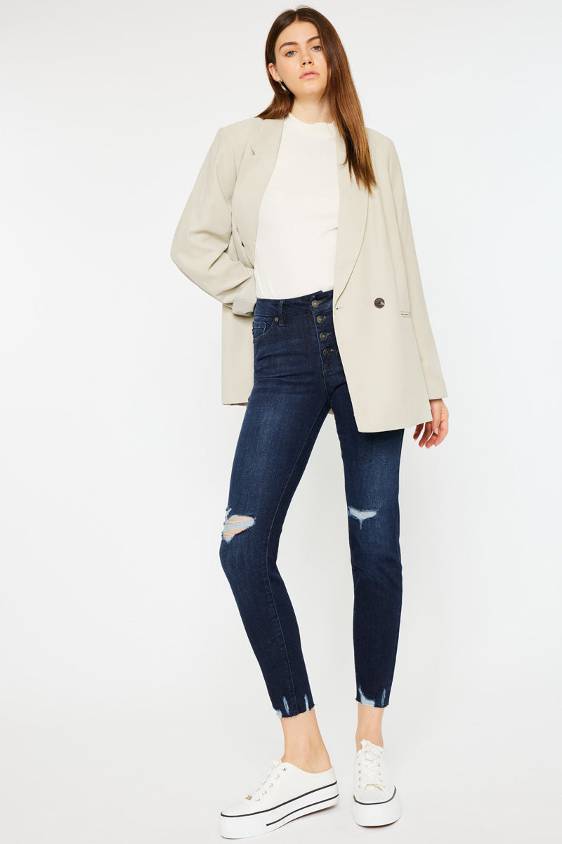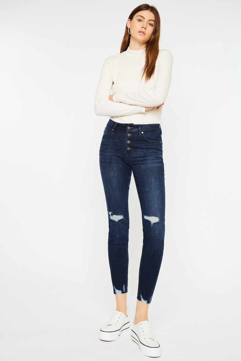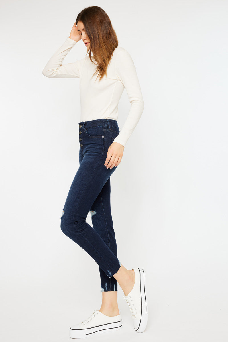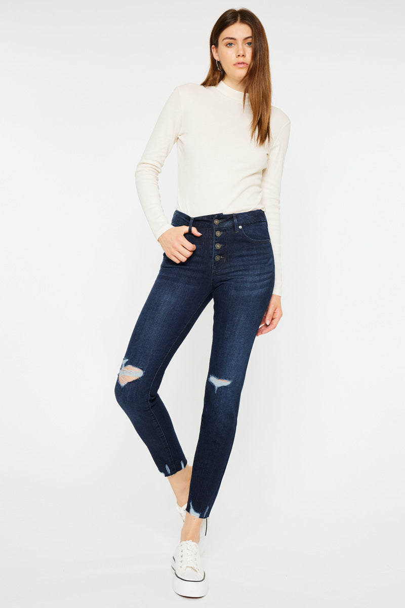 Our Penelope High Rise Jeans come with open-knee destruction and a distressed hemline that finishes right at the ankle creating a shorter skinny jean look. Sits above the natural waistline as it tapers down the leg. Made with super-soft stretch denim that's breathable and flexible enough to retain its shape even after regular wear. Features a classic five-pocket design and four-button front closure.