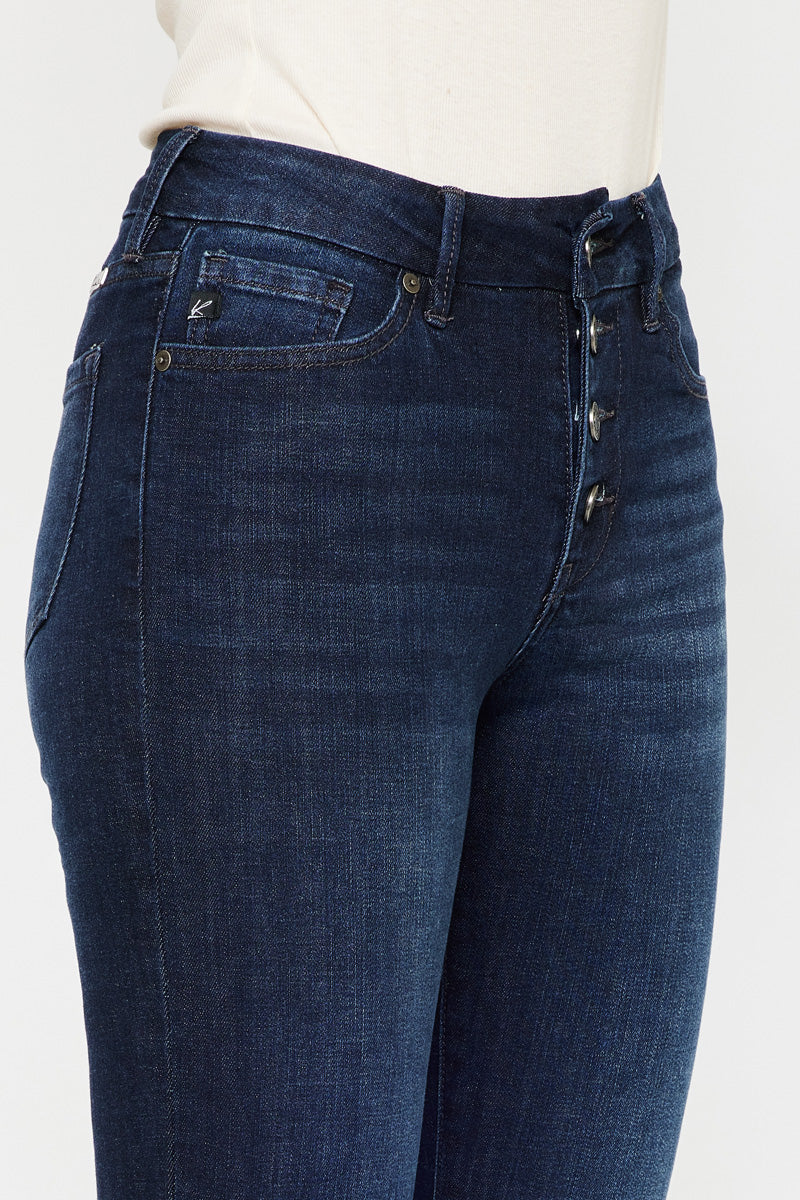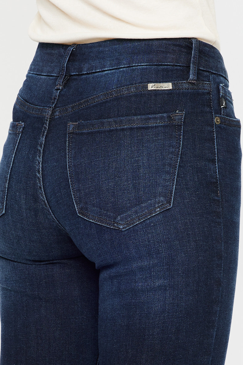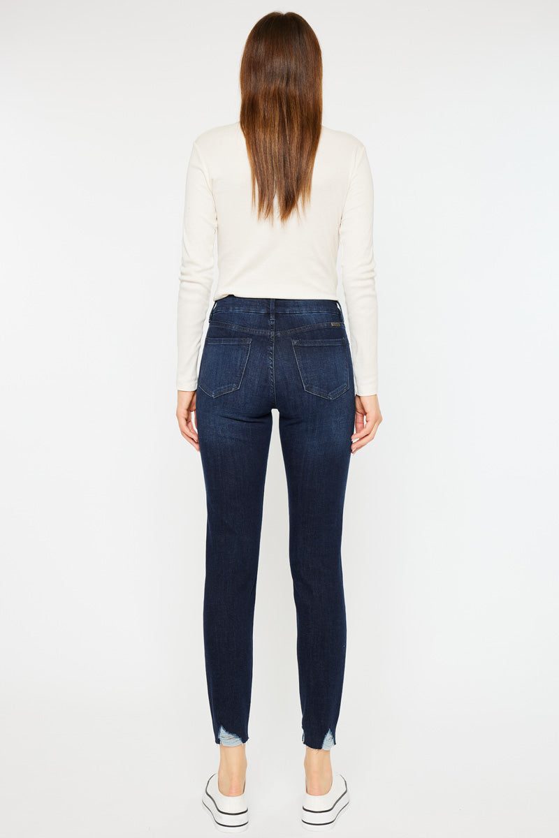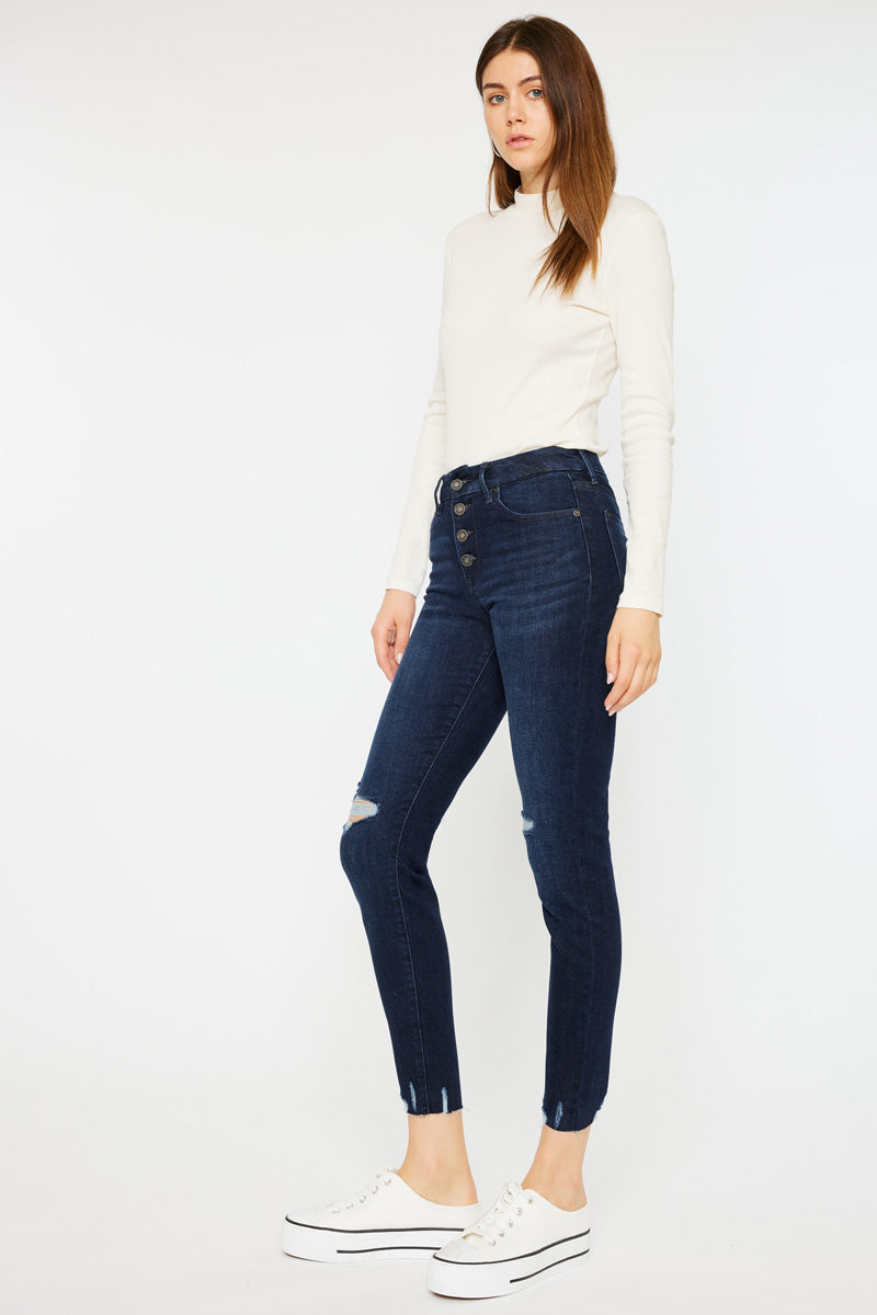 Our Penelope High Rise Jeans come with open-knee destruction and a distressed hemline that finishes right at the ankle creating a shorter skinny jean look. Sits above the natural waistline as it tapers down the leg. Made with super-soft stretch denim that's breathable and flexible enough to retain its shape even after regular wear. Features a classic five-pocket design and four-button front closure.