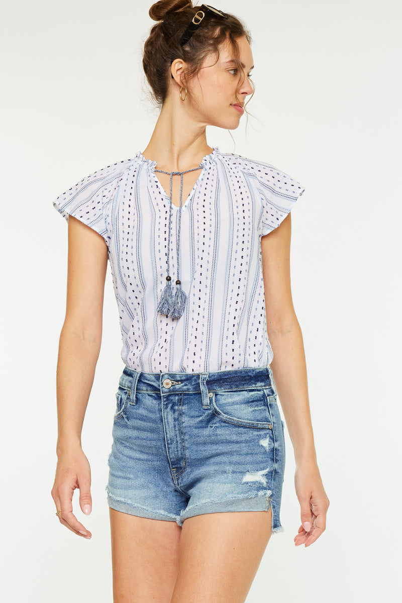 Create your next chic outfit with this our Poppi High Rise Shorts, this pair of medium-washed shorts with medium whiskering and fading. This piece comes with a cuffed frayed hem with side slit detailing. Comes in a classic short fit made with stretch denim, a 5-pocket design, a single-button closure, and a zip fly.