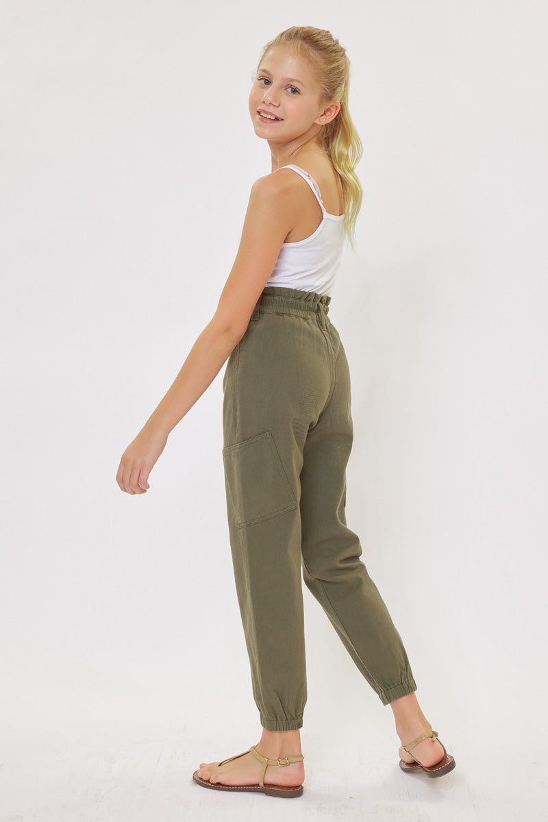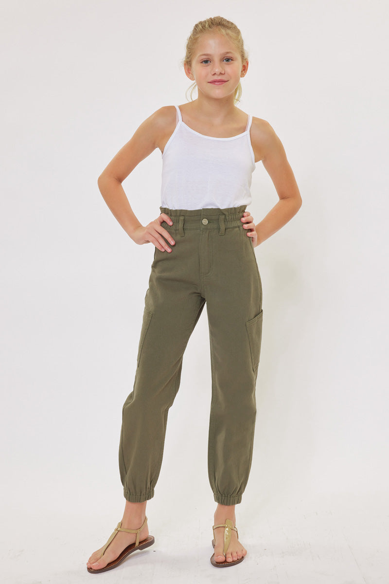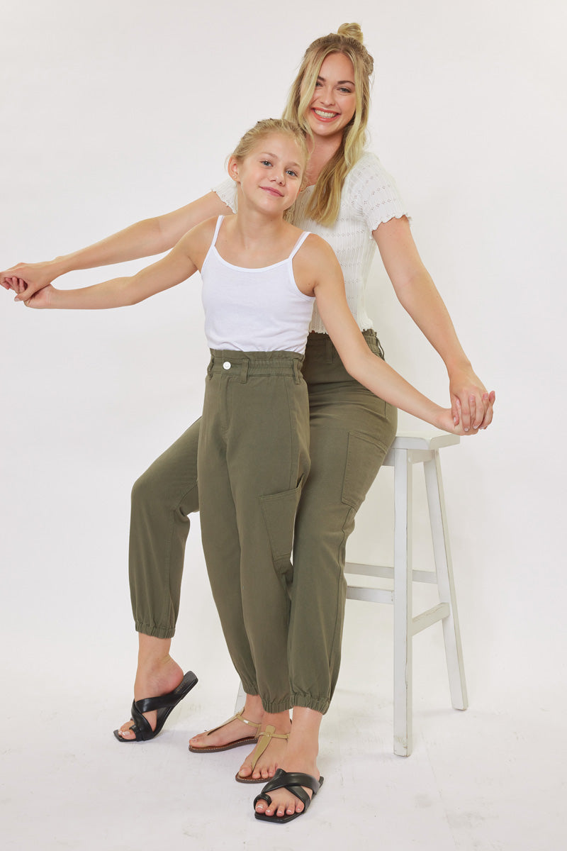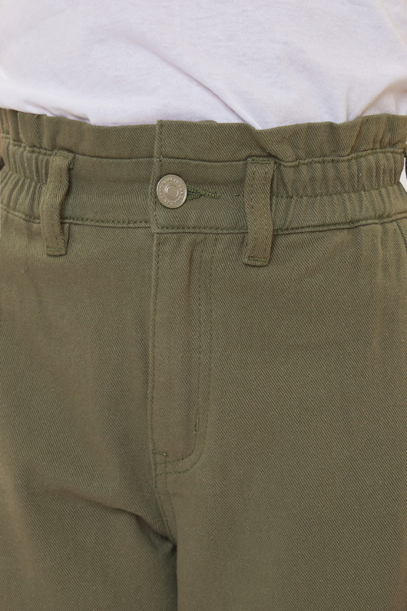 A relaxed fit comfort-stretch mom jeans featuring an easy tapered fit, mild fading, and whiskering. Made with our rigid denim so it won't bag out after multiple washes in the washer! Features two side patch pockets, an elastic band at the waist band and on the bottom hem.