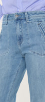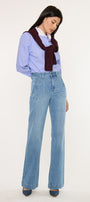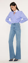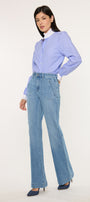 Prima High Rise Flare Jeans gives you that trouser style look in a beautiful medium dark denim style. Crafted from a soft drape denim fabric this style will give you an effortless flow with every step. Made for maximum comfort this jean will not lose its shape with every wash. Features welt front pockets, single button closure, zipper fly, back dart details and finishes off with a 1.5" hem.