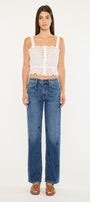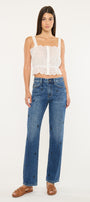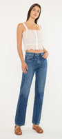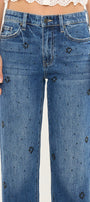 In a dark wash we have our Renata High Rise Straight Jeans. With rhinestone details throughout the front that makes this style unique. Offering a comfort stretch that will allow you to move with ease while wearing them. At the hem and pockets, we have light distressed details. Features a single button closure, zip fly and 5 pockets.