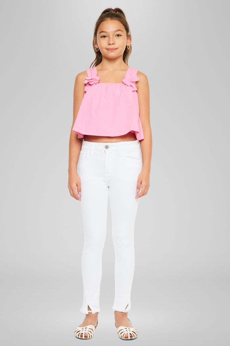 - Frayed hem, Regular 5 pockets, Single button front closure, Zip fly
