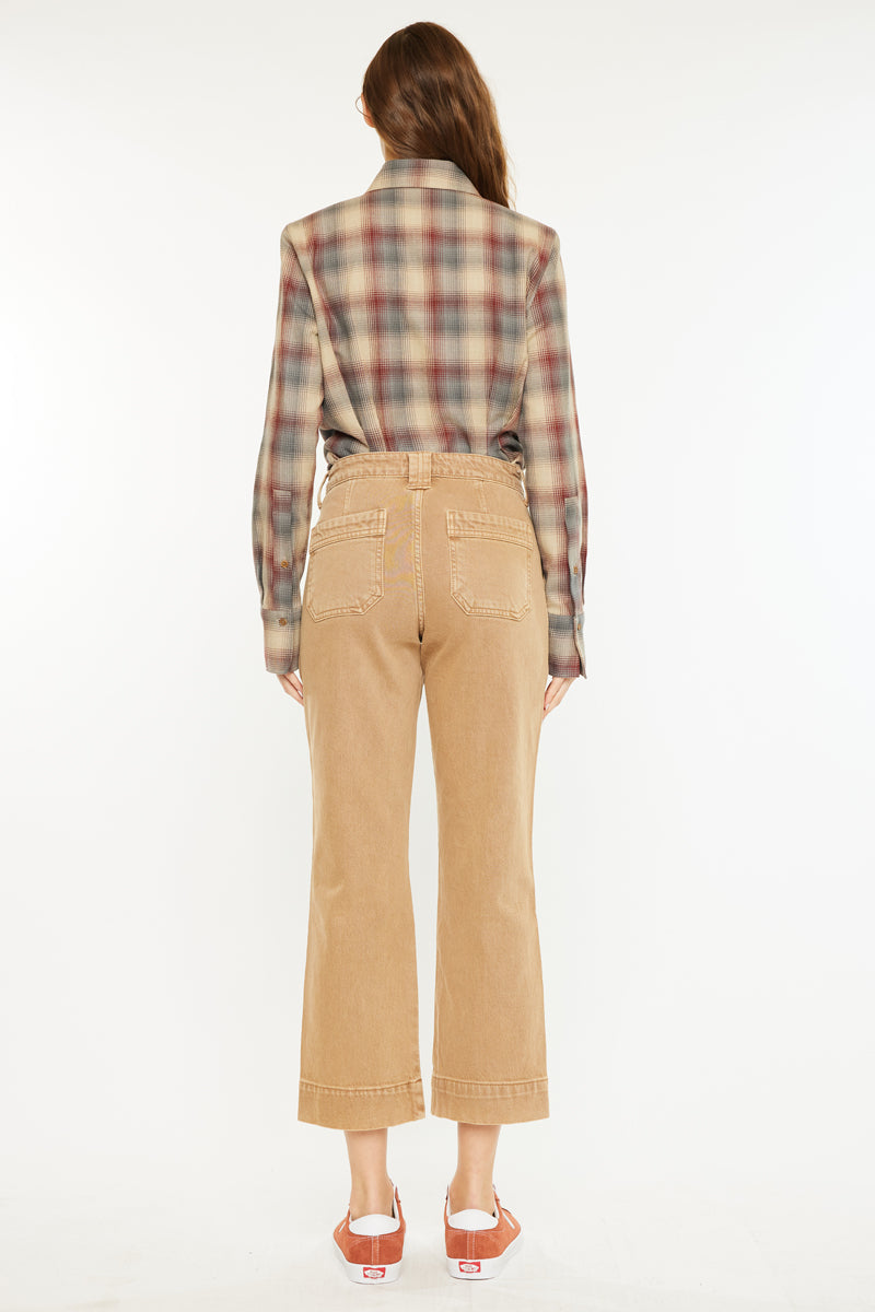 Our Riley High Rise Slim Straight Leg Cargo Jeans sits above the natural waistline as they relax down the leg for a comfortable fit. These trendy cargo pants come in a beautiful tan color, perfect for fall. With button details at the front 2 patch pockets along with at the bottom of the jean. Features a four-pocket design, and adjustable hem, a single-button front closure and a zip-fly.