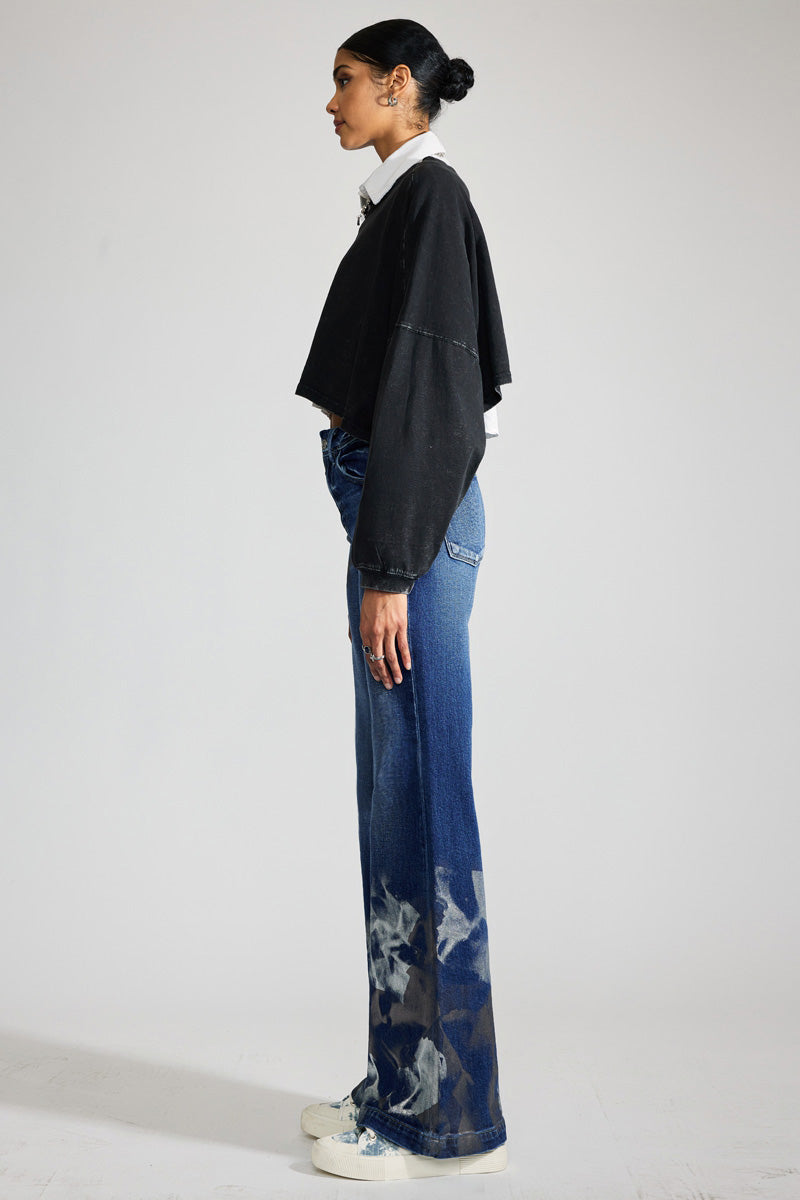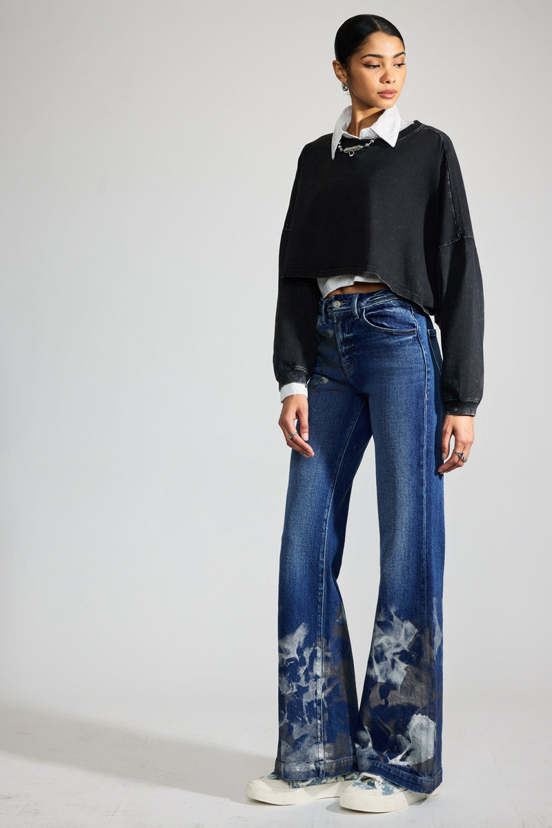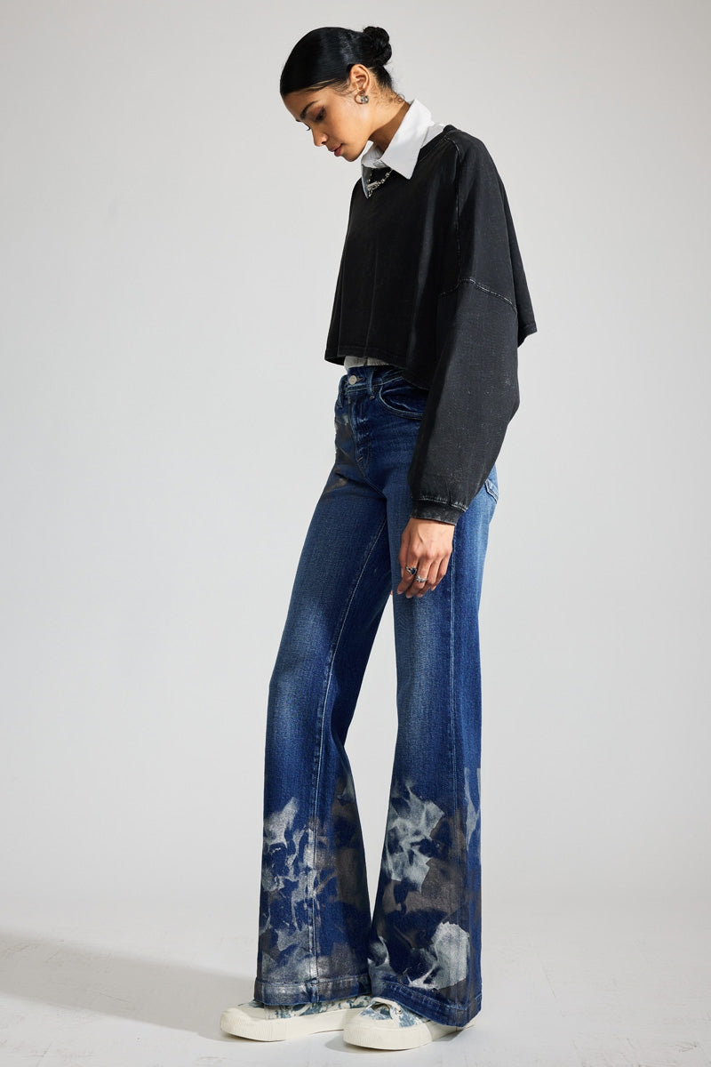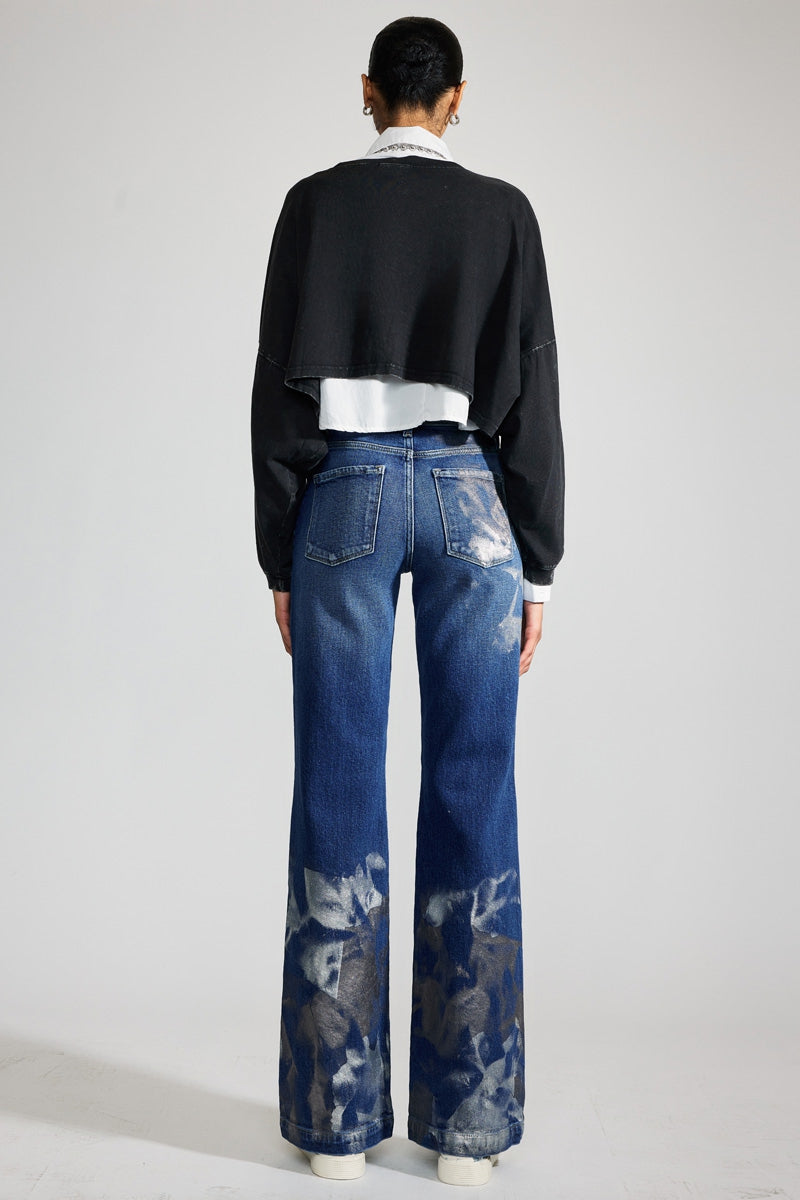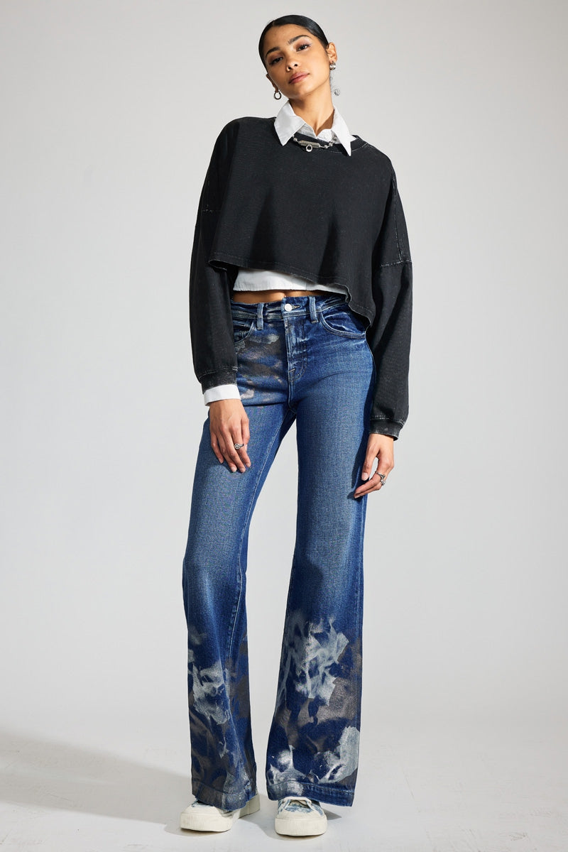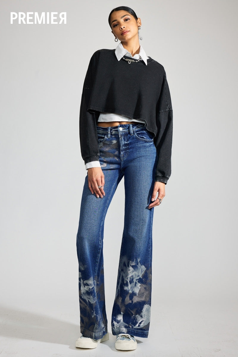 Our Rosaline Premier High Rise Holly Flare Jeans are made domestically in small batches by a local wash factory in Los Angeles. Each pair of this denim is single-handily, finely washed in a beautiful light wash color. Sits above the waist and relaxes throughout the leg for a straight leg fit. Features a beautiful silver foil detail that makes the jeans shine like a mirror ball, 5-pocket style, one button closure, and zip fly. Feel good about what you wear in these premiere Kancan jeans.