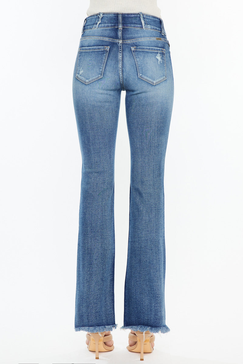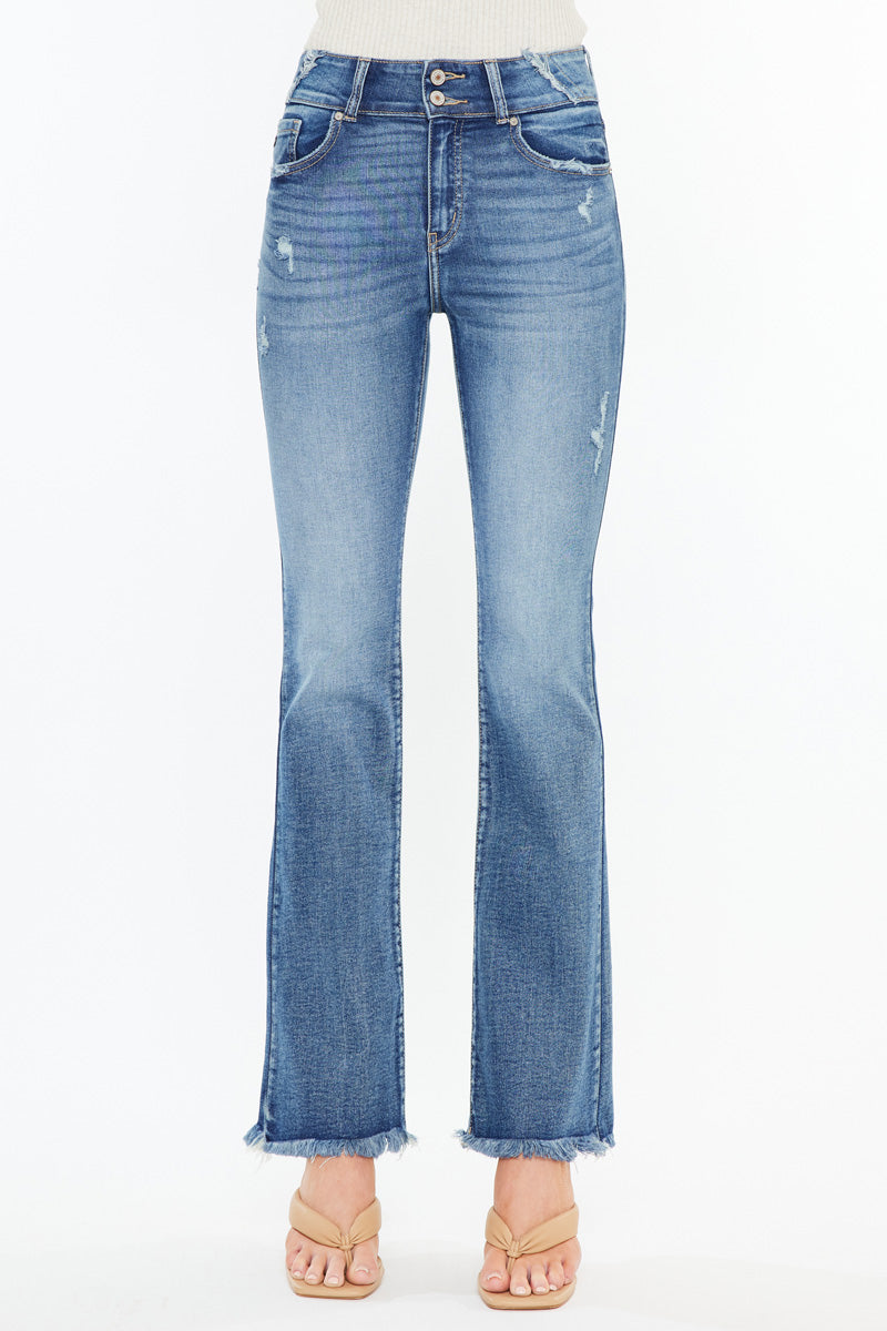 - Pleat and dart detailing, raw waistband edges, frayed hems, wide waistband, zipper-fly