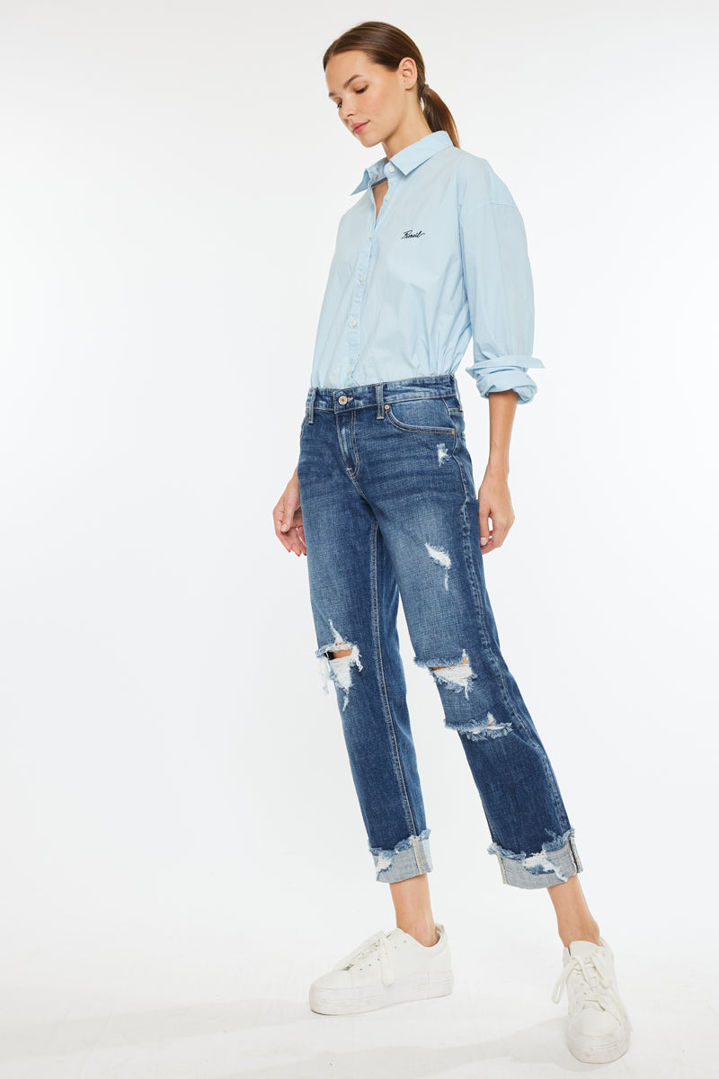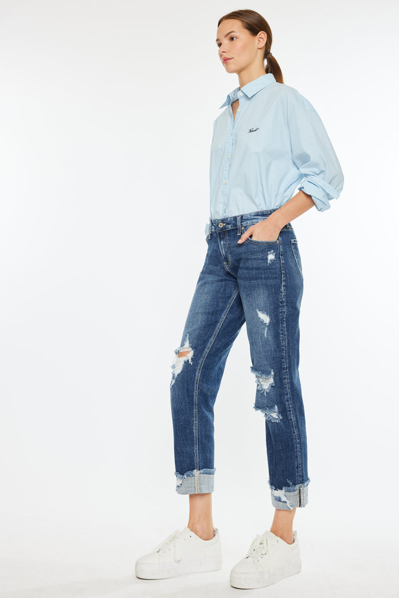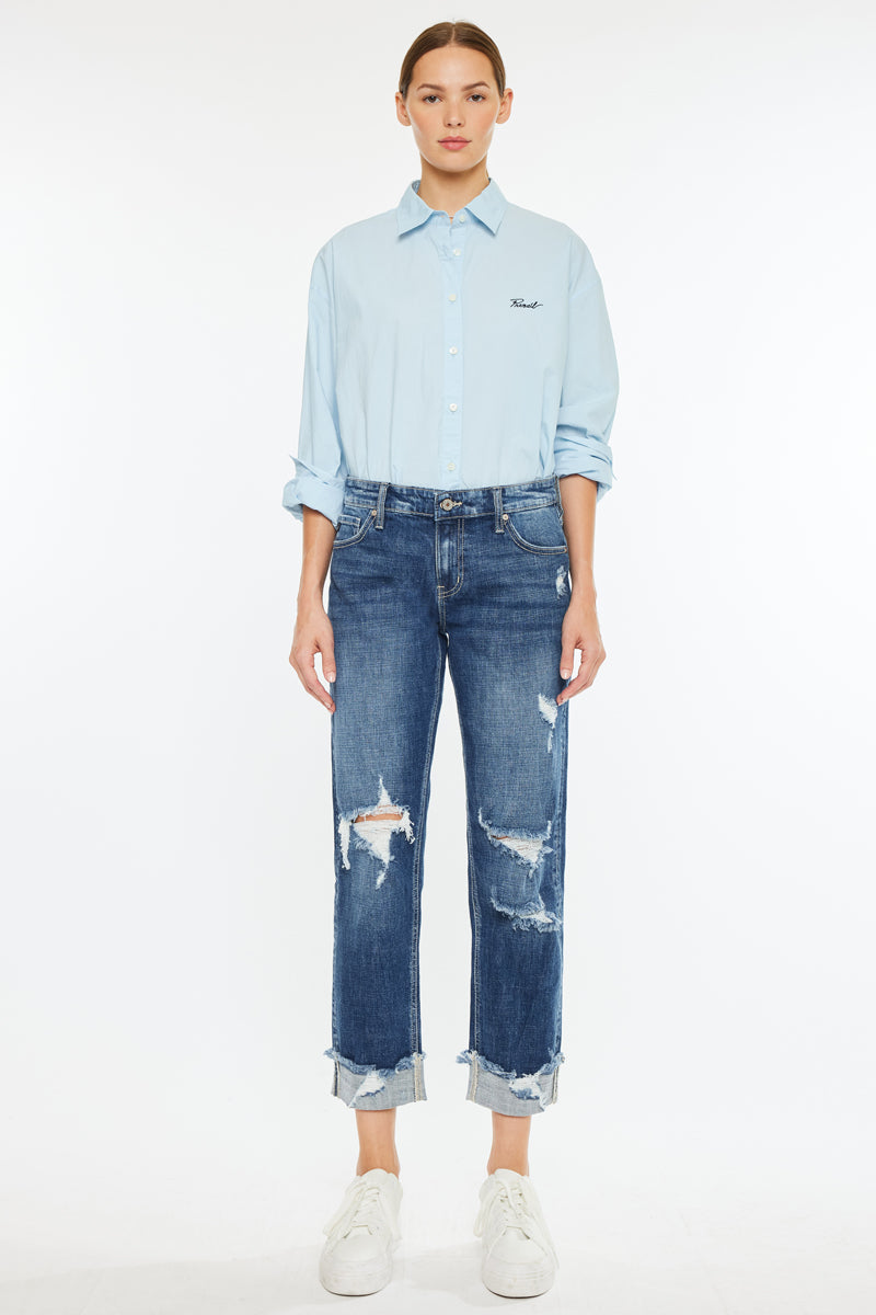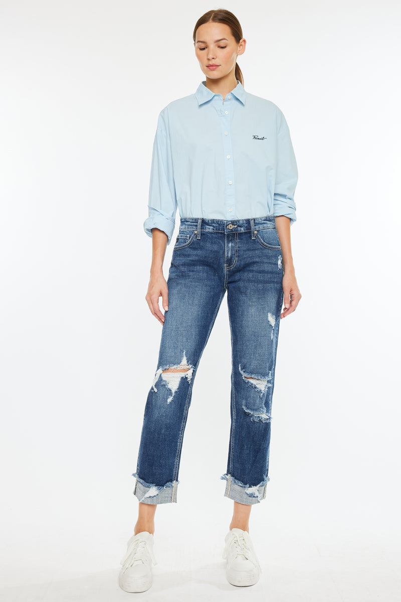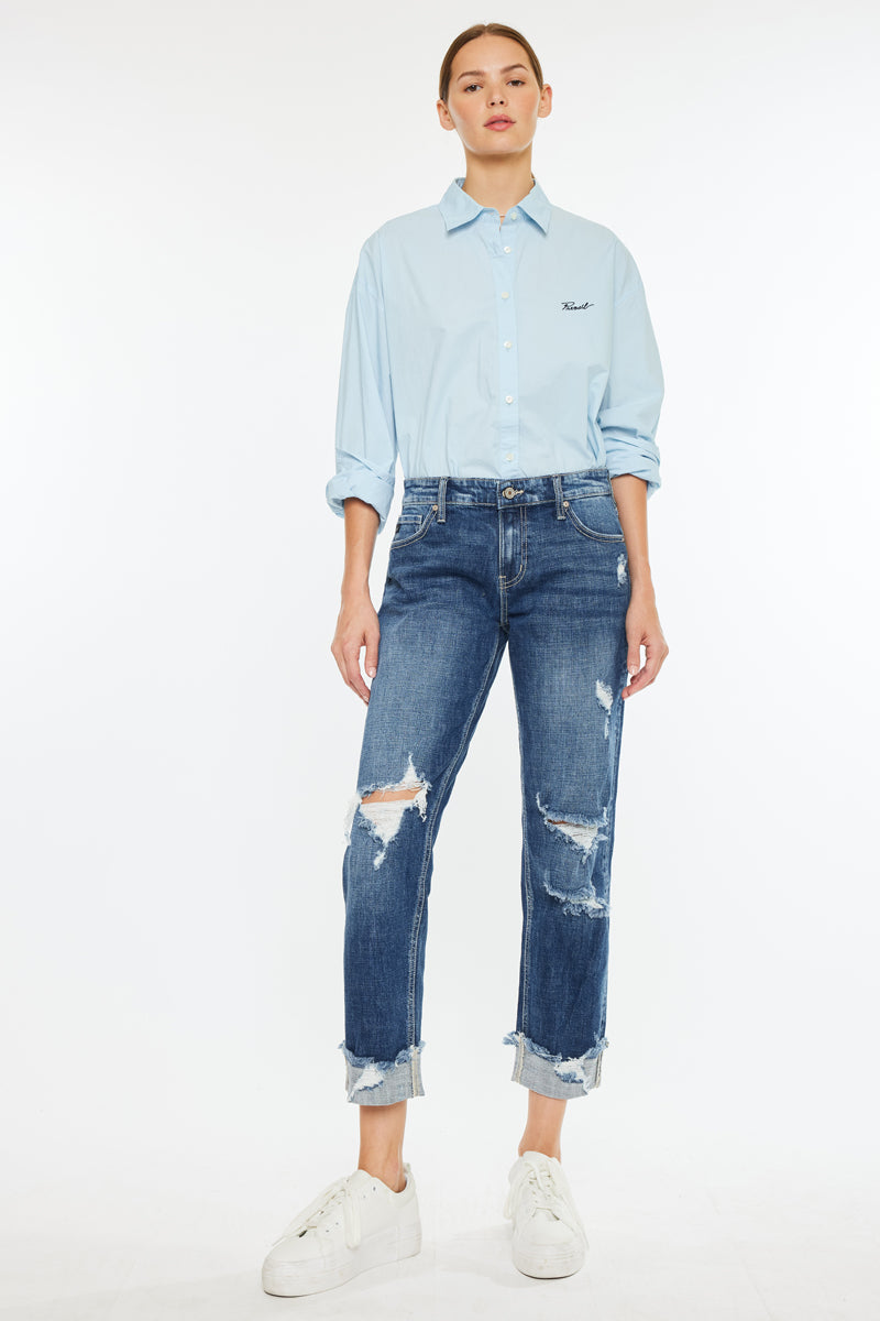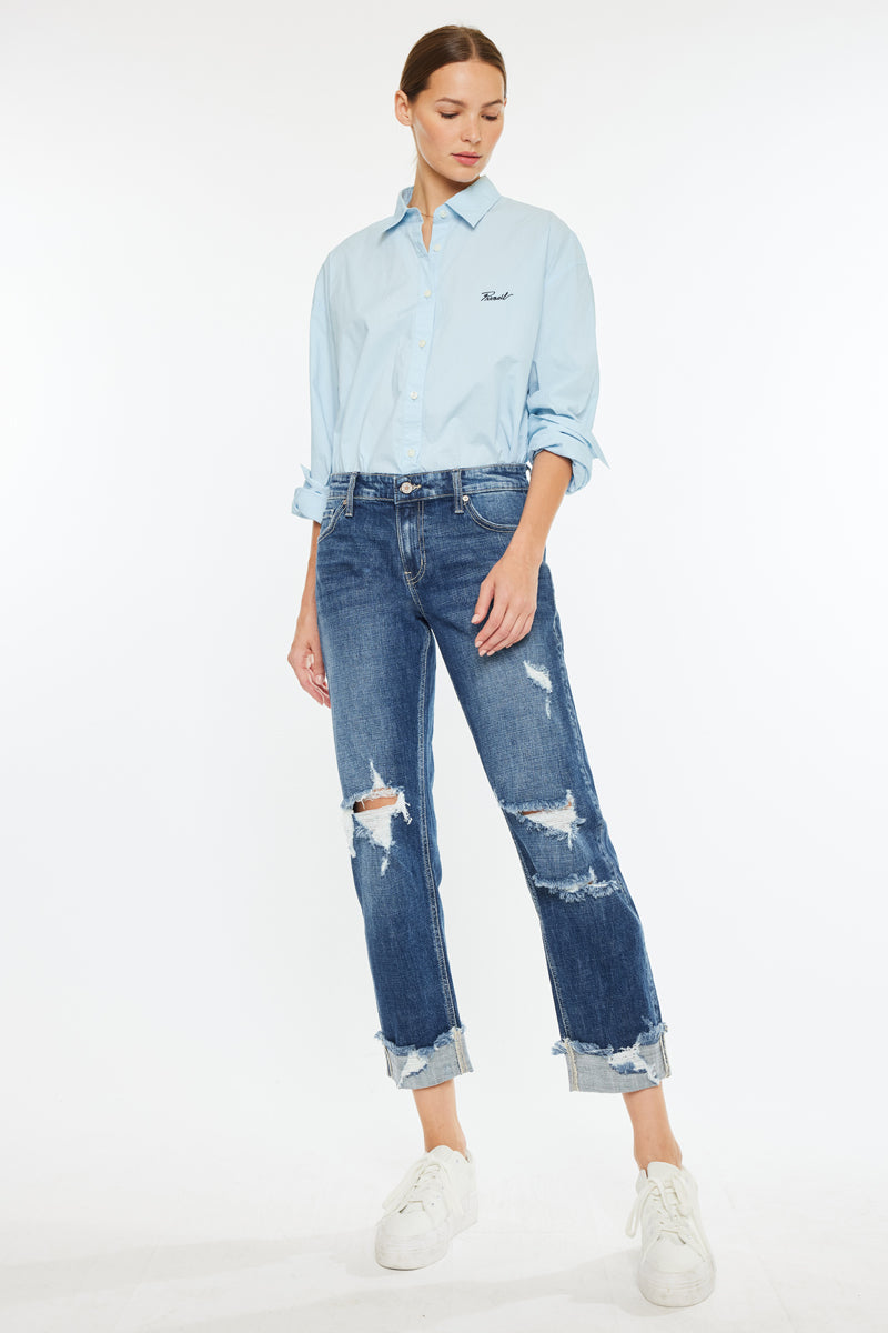 Dark blue denim with whisker details and moderate distress for a lived-in look that's perfect for dressing up or down. Our Russel Mid Rise Jeans sit right at the natural waistline as they relax down the leg, creating a loose-fitting silhouette. Made with comfort-stretch denim that maintains its shape even after multiple wears. Features a classic five-pocket design, single-button front, and zip-fly closure. Finished with gold-colored hardware.