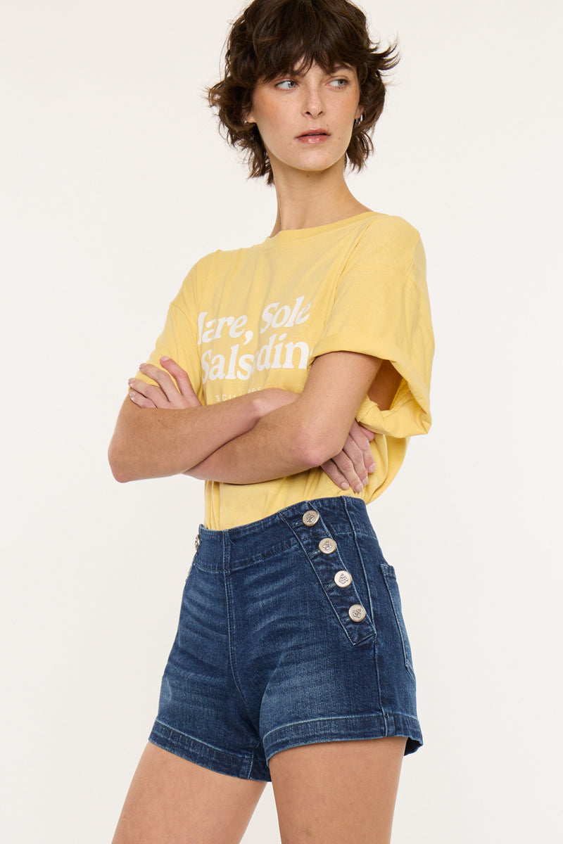 Sallie High Rise Shorts comes in a sailor style. In a rich dark wash color with silver metal buttons along the side. This comfort stretch style is meant to give a flattering silhouette. Features side button closure, silver metal buttons, back dart details, and a 1" hem.
