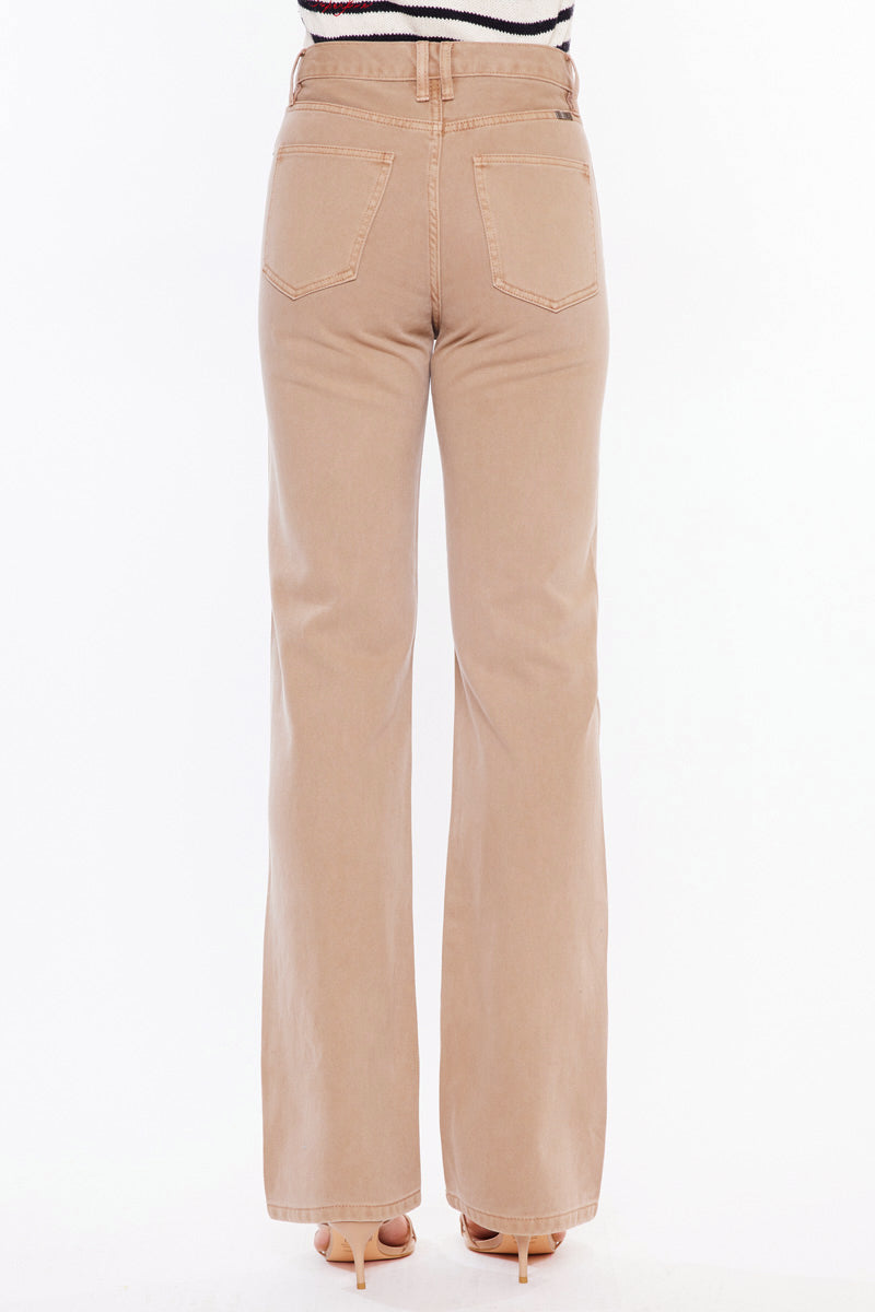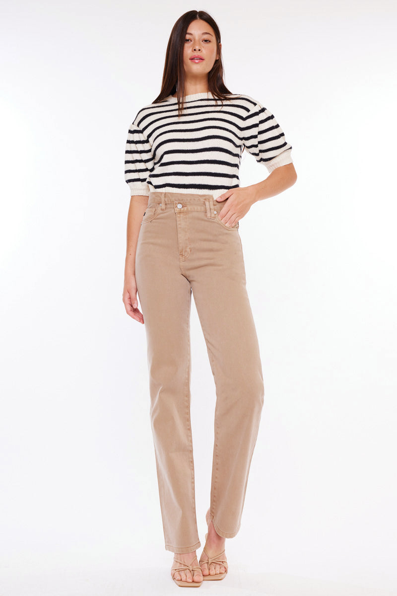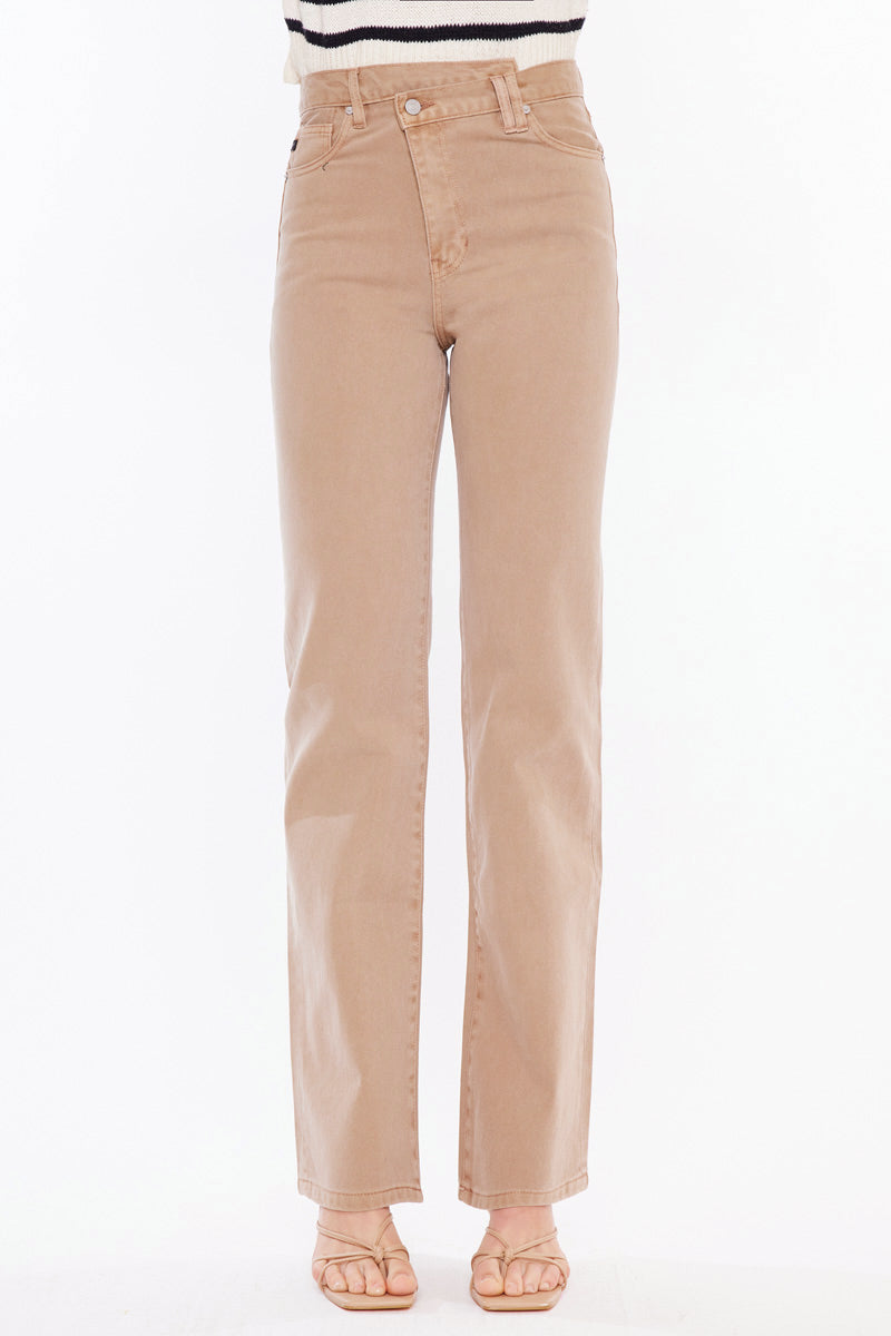 Our Sandy 90's Straight Jeans features a slight cross over front waistband, slight knee distress, and hidden button closures. These jeans come in a beautiful brown wash that could be accentuated with any other color combination. Made with rigid denim that holds its shape while retaining a buttery-soft feel.