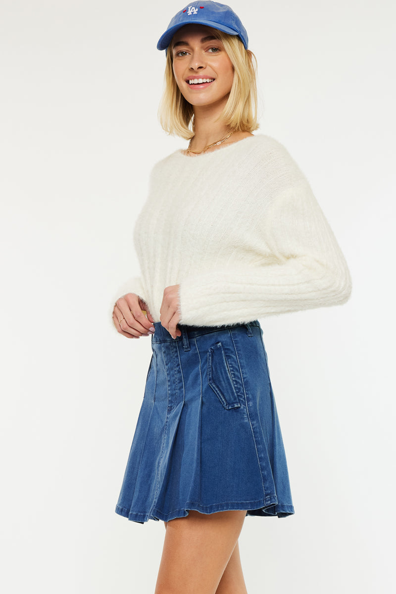Try our new super cute and fun style High Rise Pleated Mini Skort! In a Dark Indigo color that gives it a slick clean look. With an A-Line silhouette this skort has pleats throughout the bottom of the skirt, side pocket with flap and stitch details. This skort has an elastic waistband that'll hug you tight at the waist and inner legging shorts for coverage. Get ready to wear this cute stylish pleated skort on your next day or night out!