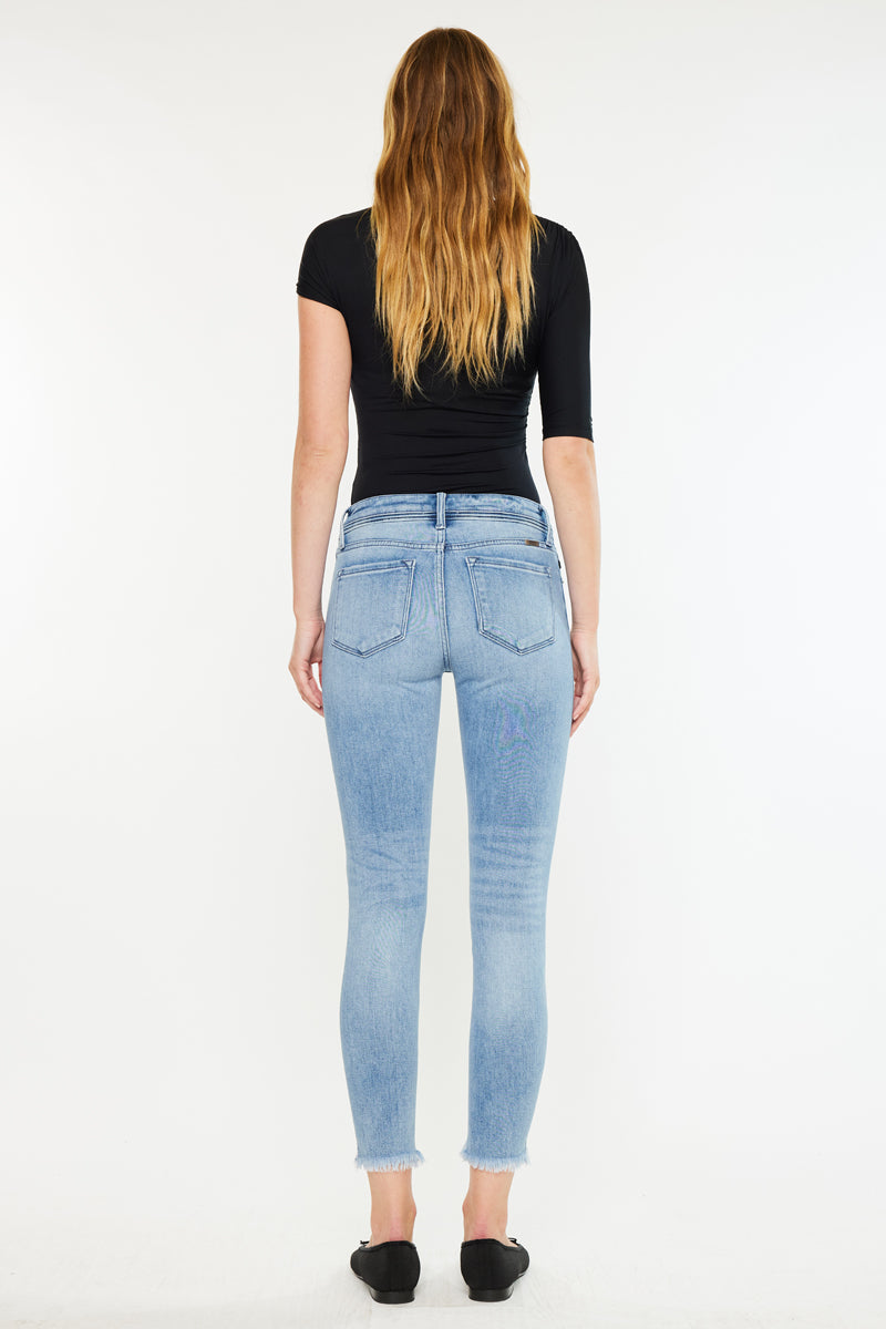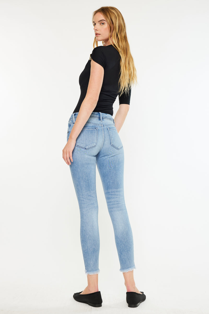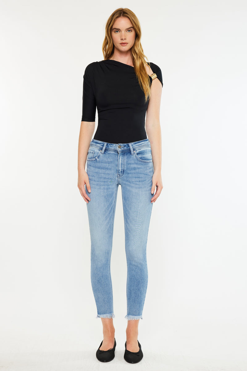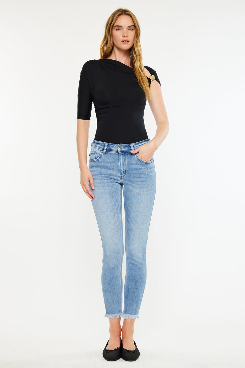 Our Silvanna Mid Rise Ankle Skinny Jeans come in a medium wash in a classic ankle cut style. The jeans sit right on the hip and hug your silhouette down to its frayed hem. It has light fading and whiskering and features a 5-pocket style, single button closure, and zip fly.