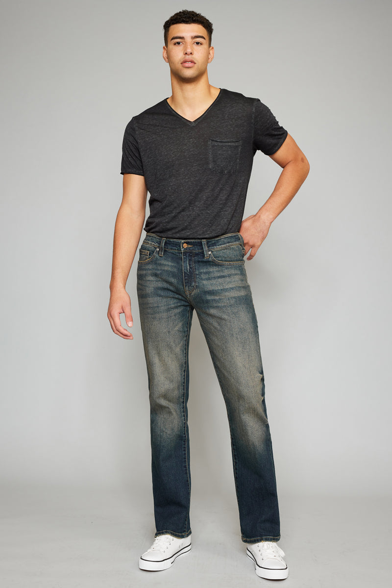 Show off your everyday style with a little denim twist featuring a slim straight fit, a medium wash, whiskering, fading, contrast stitching, a single button zip fly closure, and a 5-pocket design.