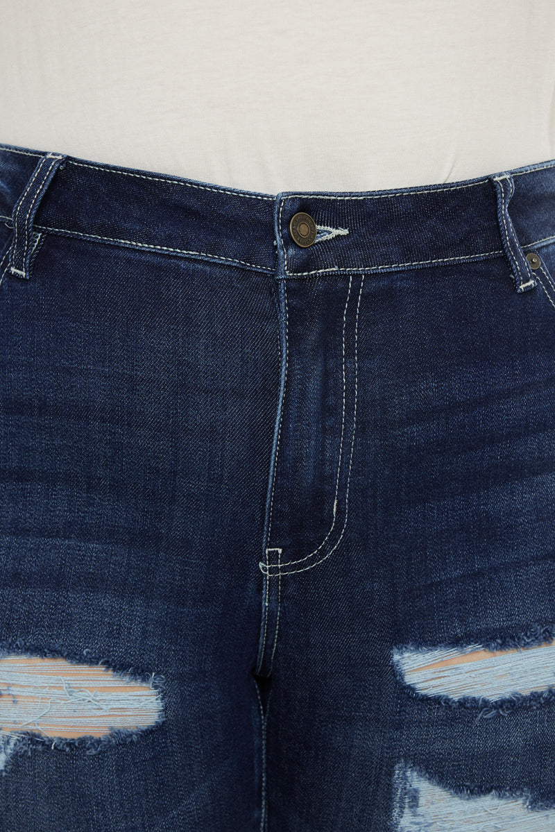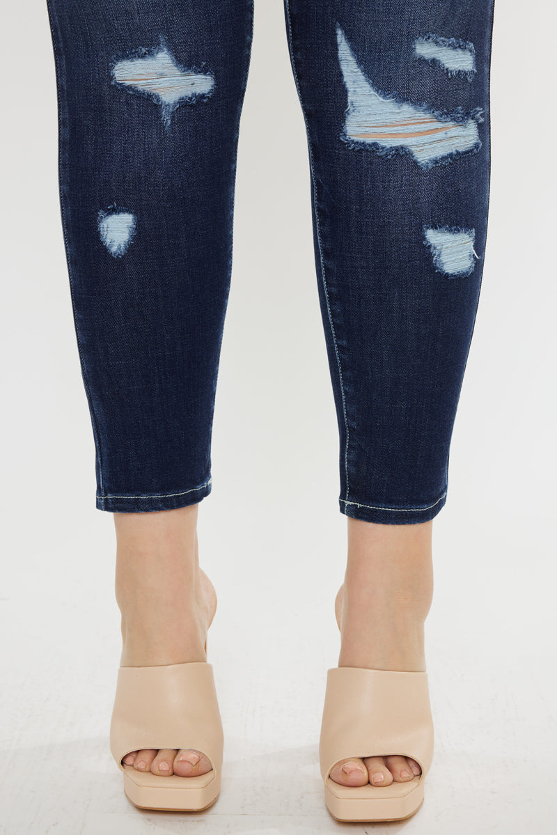 Distress finds a new meaning with this dark blue high-rise super skinny. This style comes with heavy distress that accents a beautiful deep blue shade. Perfect for creating a ruggedly chic look.