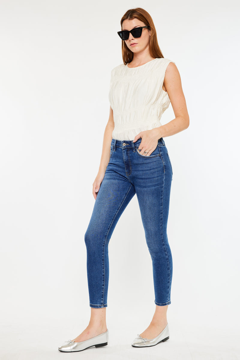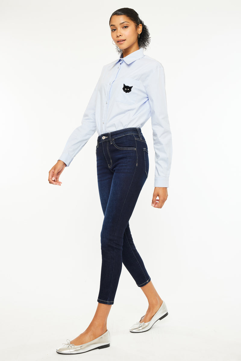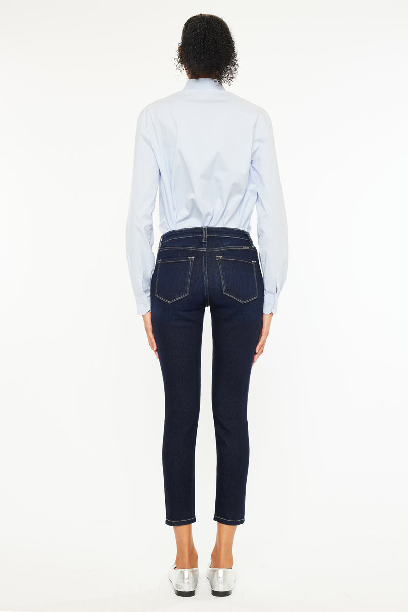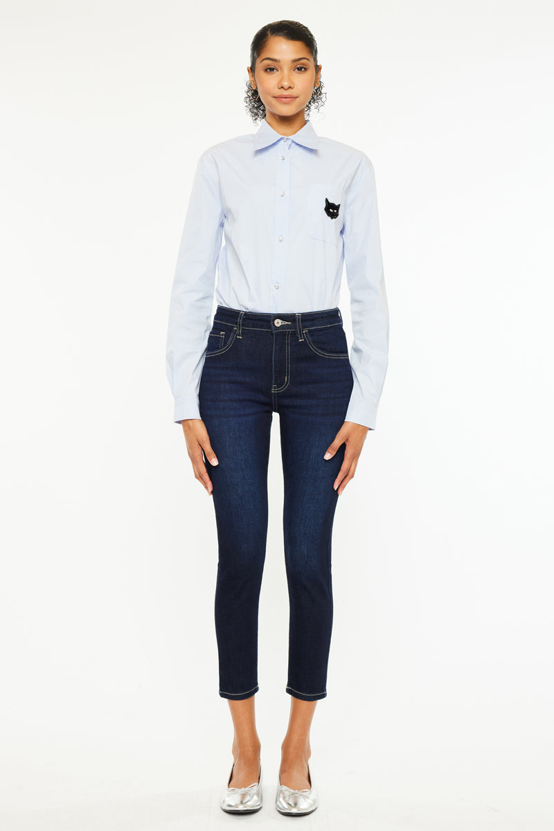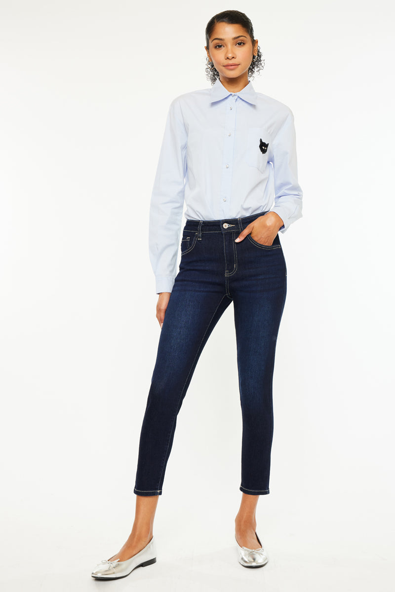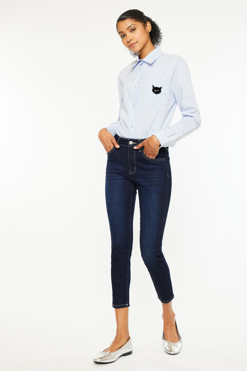 Our Teegan High Rise Cropped Skinny Jeans comes in an immaculate dark wash with light whiskering and gentle fading. Sits comfortably above the natural waistline and is form-fitting from the hips to the legs. This style has a cropped hem to show a little ankle and your shoes. Made with 71% sustainable cotton for our eco-friendly pledge. Features the five-pocket design, single-button front, zip-fly closure.