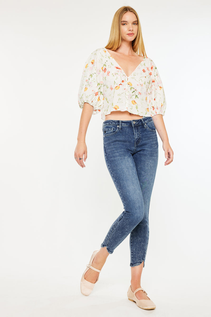 Our Temple Mid Rise Ankle Skinny comes in a beautiful medium blue wash with light fading and whiskering. These ankle skinny jeans are the perfect addition to your wardrobe. With its curved split hem and twisted seam, it creates the best body-shaping figure with unique detailing. Features a 5-pocket style single front button closure and zip fly.