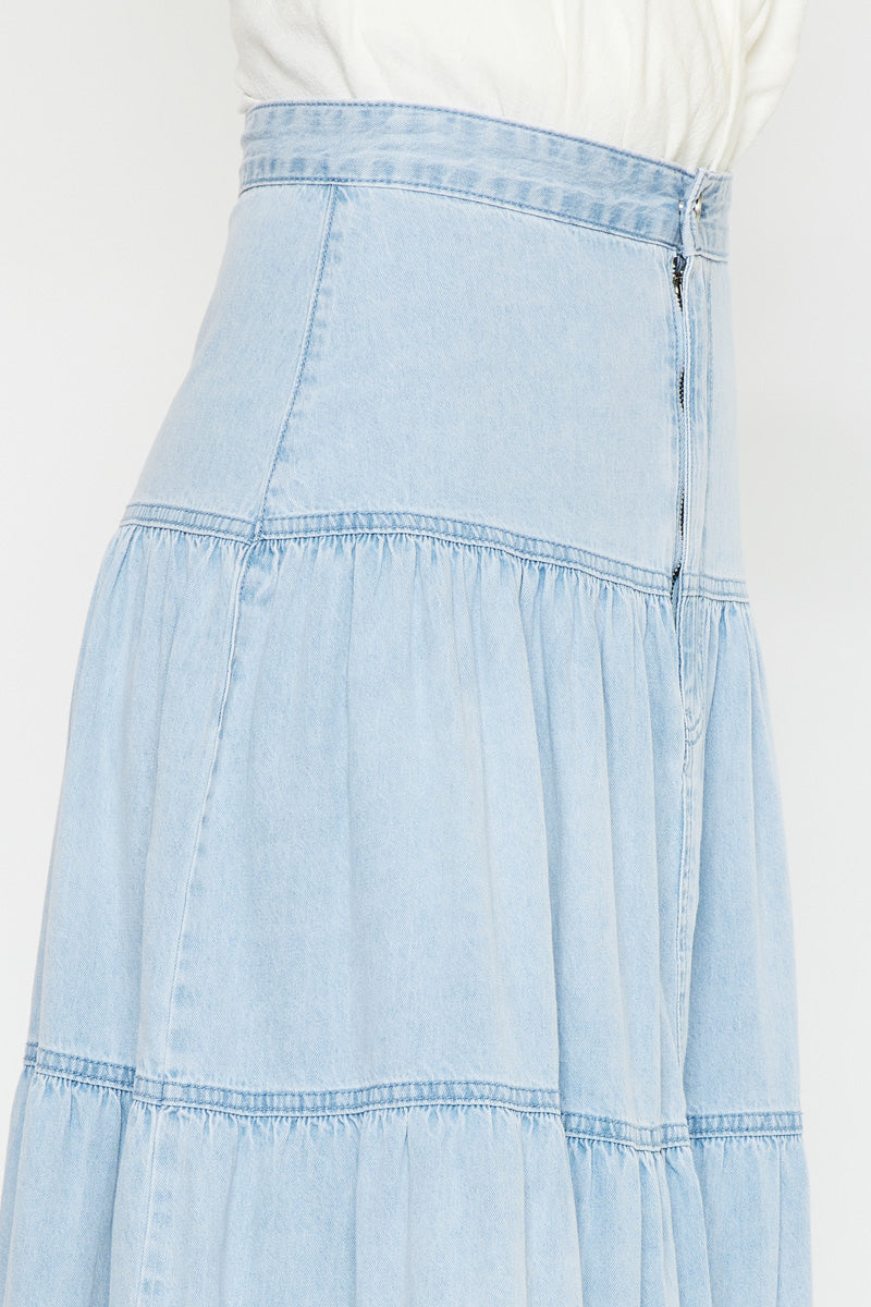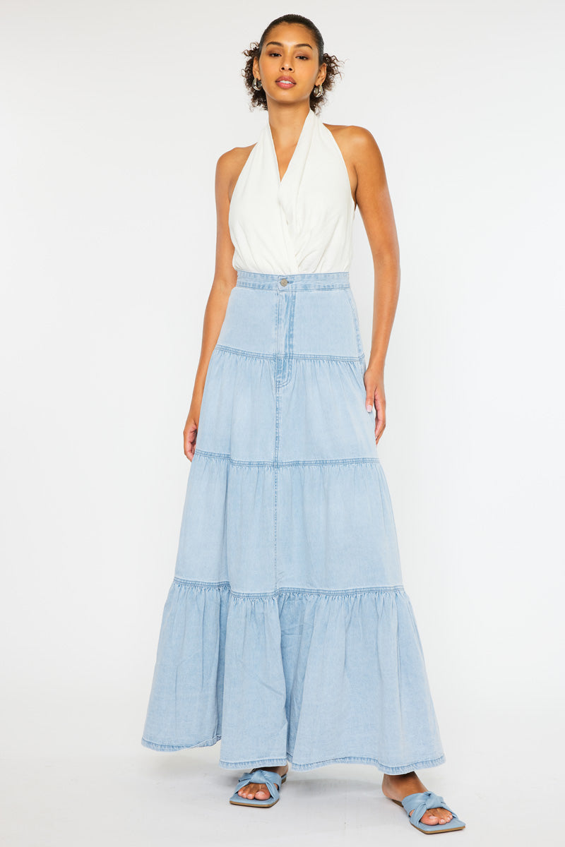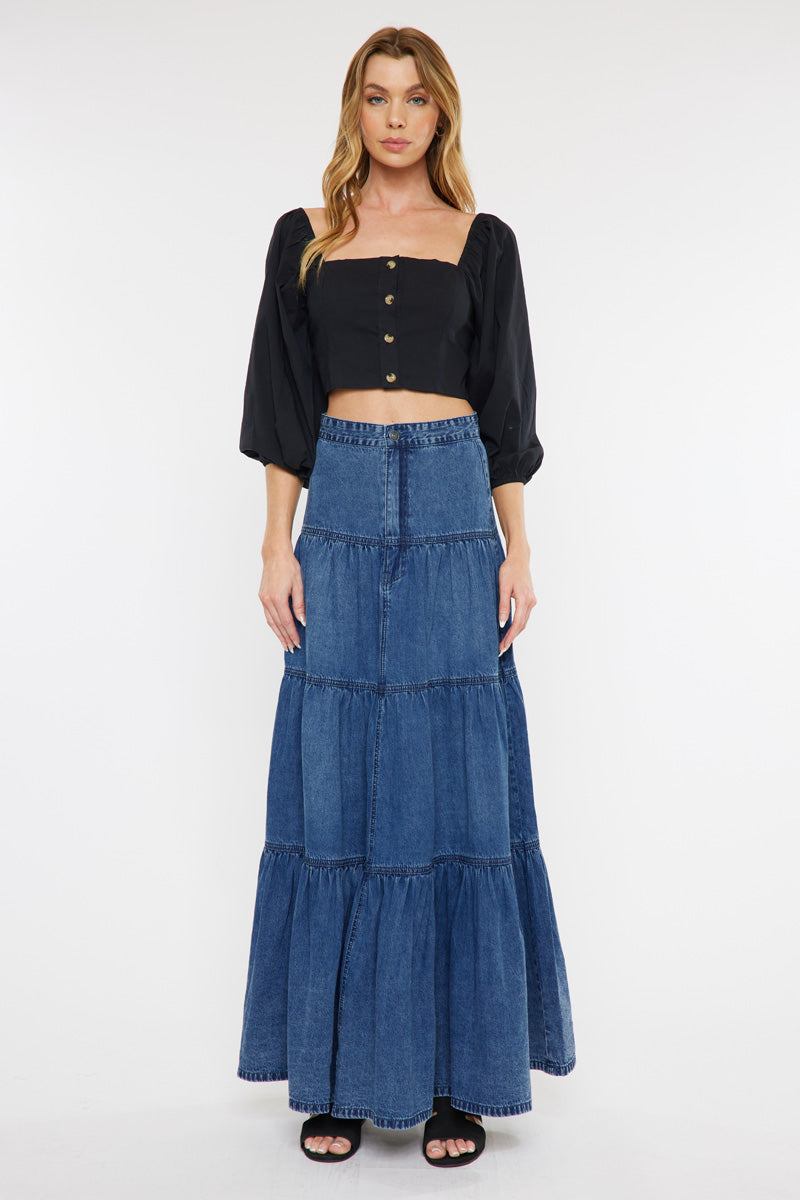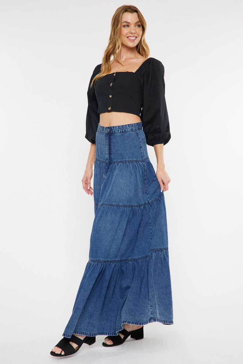 Enhance the look of your everyday wardrobe with this stylish maxi skirt. The perfect skirt for a picnic. Maxi skirt with block detail, ruffled hem. Features a narrow cut that sits close to the body, no pocket design, and single button closure with a zip fly.