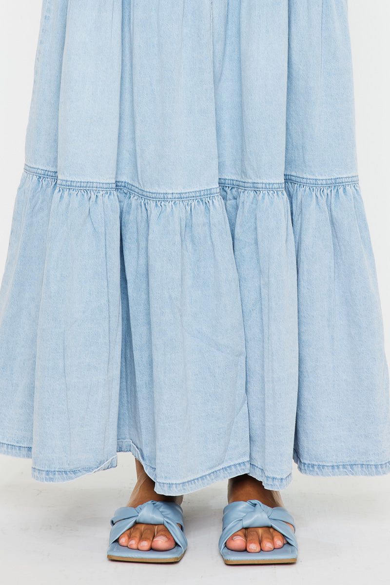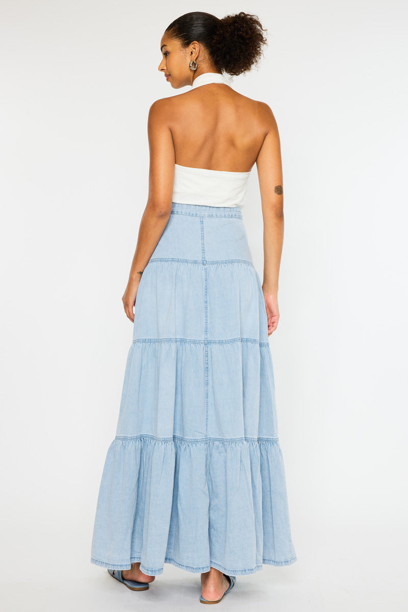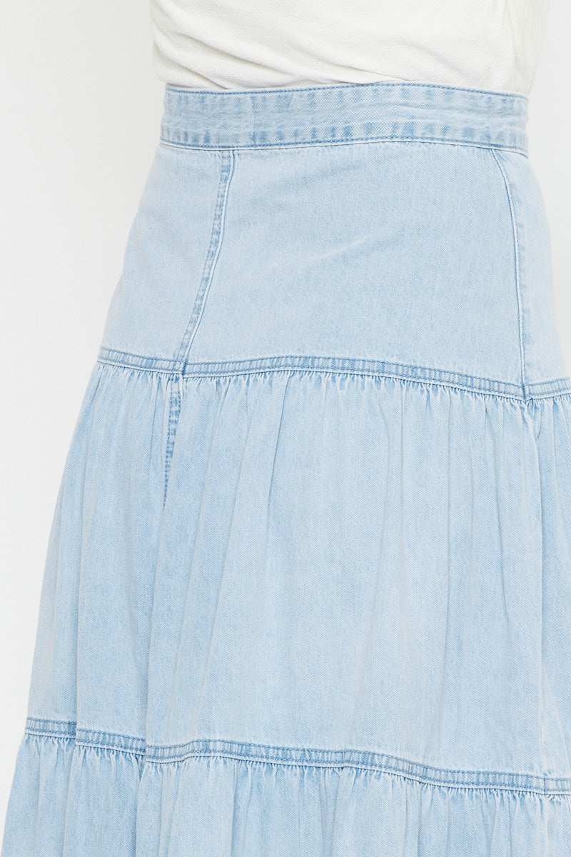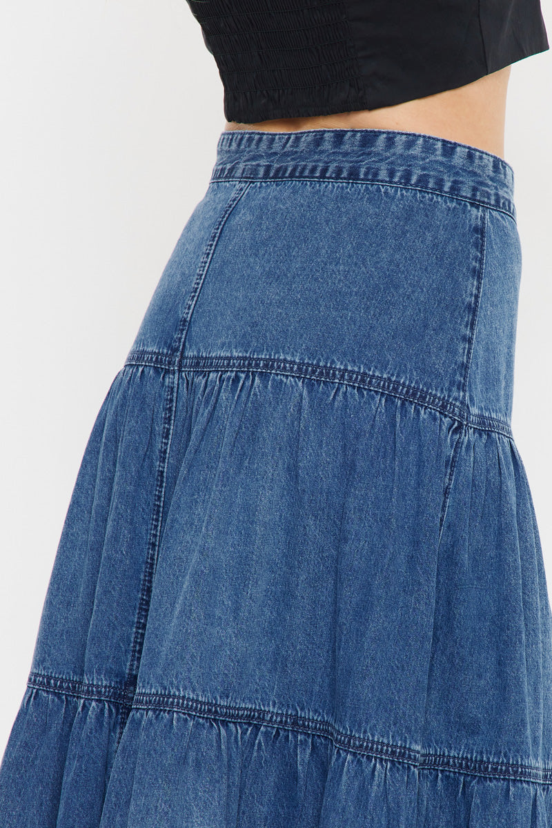Enhance the look of your everyday wardrobe with this stylish maxi skirt. The perfect skirt for a picnic. Maxi skirt with block detail, ruffled hem. Features a narrow cut that sits close to the body, no pocket design, and single button closure with a zip fly.