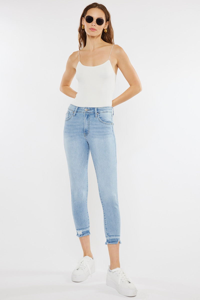 Our Thomasin High Rise Cropped Skinny Jeans come in a light stone-washed color. It has whiskering and light fading with a released hem that sits at the calf for a cropped look. These skinny jeans sit above the waistband and hug your figure with a yoke-cut seam. Made with our stretch denim so you stay comfortable and flexible all day! Features a 5-pocket style, distressed released hem, single front button closure, and zip fly.