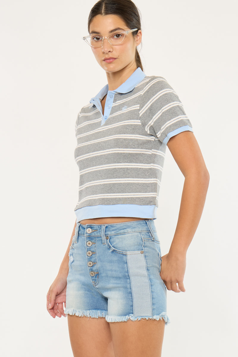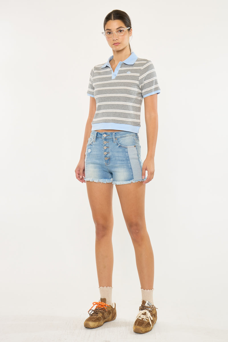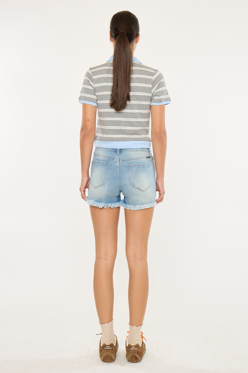 Light-weight denim with moderate distress and a frayed hem for a lived-in look that's perfect for the summer season. Our Tiffany High Rise Shorts sit above the natural waistline for a trendy fit that will never go out of style. Made with rigid denim that holds its shape while allowing you to move with ease. Features a classic five-pocket design, and a 4 piece button closure