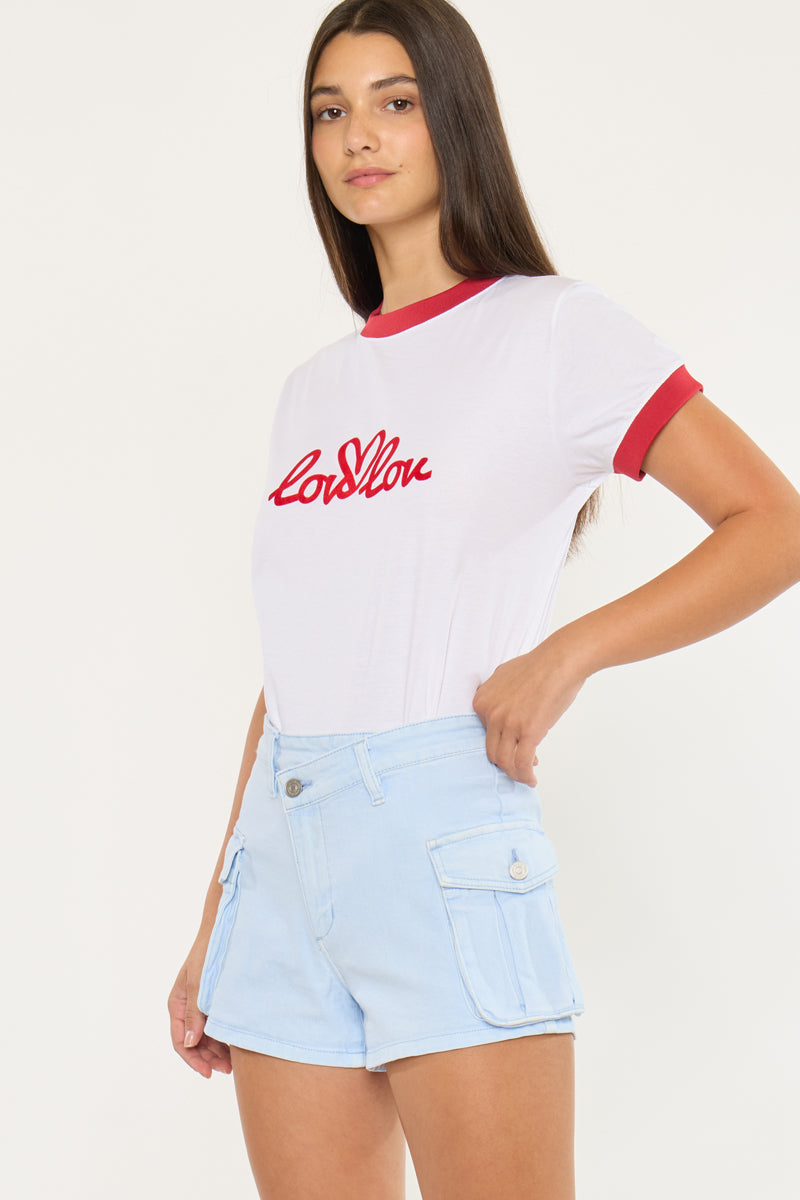 - Side patch pocket, regular hem, crossover waistband, and zipper fly