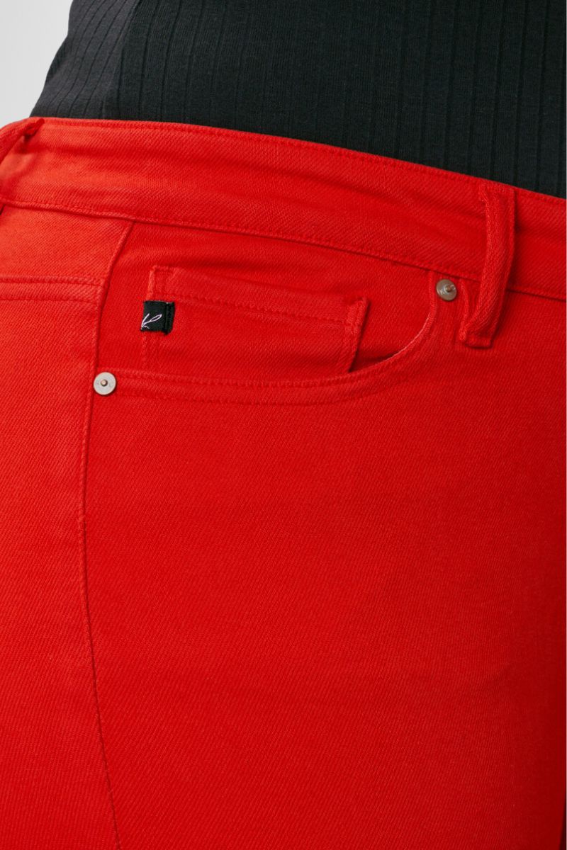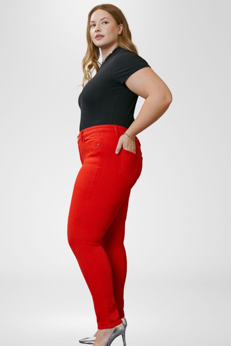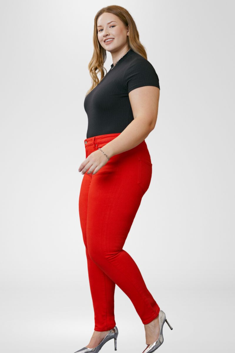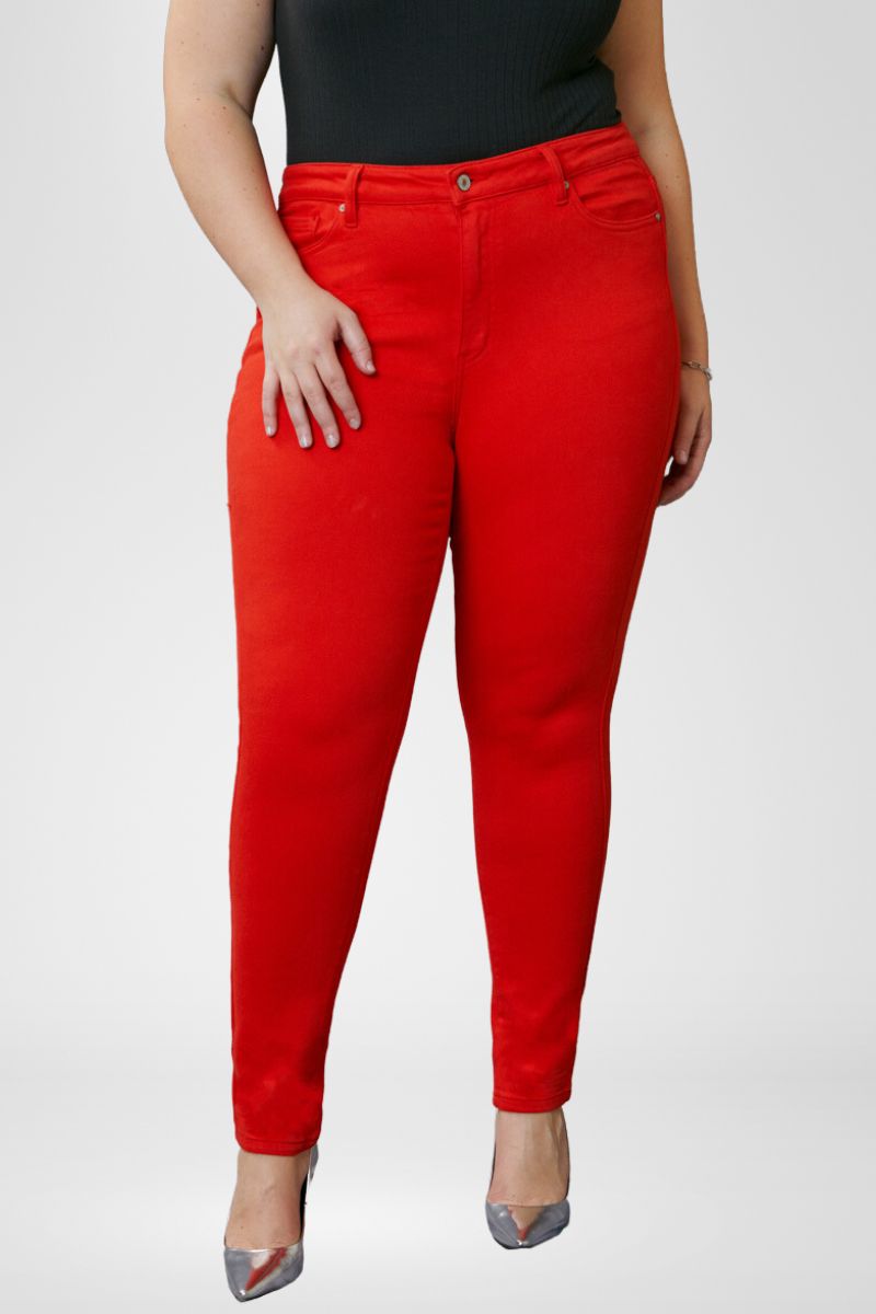 These vibrant red skinny jeans give this fit a modern look with a sleek design. It's a standard skinny with a bright color for those that like to make a statement or are a little on the wild side. Sitting right at the waist with a clean hem. Featuring a 5-pocket design with a single-button closure and zip fly.